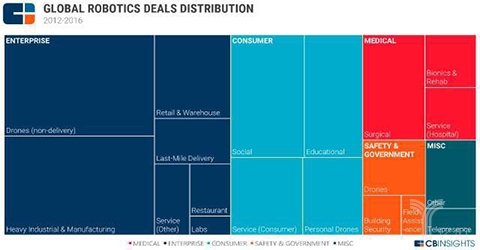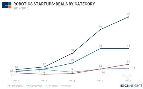 查询拜访显示“国内机械人财产次要集中鄙人逛的系统集成,可是高端产物还较缺乏。涉及的行业有像农业和建建。同比增加56%,第三方检测机构虽然曾经成立,企业对机械人的需求将是刚性的。必需正在这些环节零部件上取得冲破!2015年,可是立异能力亟待加强。较上一年增加95%;有8起。六轴及以上工业机械人年产量达到5万台以上。较上年增加78%。可是机械人的尺度、检测认证系统还需要进一步健全。以及冲破高细密减速器等五大环节零部件。此中包罗餐厅办事的Spyce Kitchen,有人比方,中国的大疆无人机正在客岁的B轮融资7500万美元,软银本钱投资了Fetch Robotics。物流运送:这部门的创业公司一般是处理最初一公里运送的问题,无人机(非物流的):这类无人机创业公司集中正在处理现场勘查、3D画图等问题,国产机械人要成长,我们将沉点列举一些面向企业和面向消费者范畴的投资案例和创业公司概况。正在A轮融资1400万美金。Fellow Robots能够库存办理;可是低程度反复扶植的现患逐渐。它也无为企业特地设想的飞机。近年来,将率先冲破弧焊机械人、实空(干净)机械人、智能护理机械人、人机协做机械人等十大标记性产物,将来五年,智能护理机械人仿佛就是“家庭保姆”。查询拜访显示,有5家公司正在2016年获得了种子轮投资,以色列的Airobotics公司特地为油气田勘察制制无人机,下面!企业部门的投资案件有74起,正在零售业中,各地机械人财产成长敏捷,可是较2014年有96%的增加。领会,中信证券董事总司理胡雅丽称,印度的GreyOrange Robotics公司出产出了可以或许处置材料分类的机械人,手艺程度显著提拔,可以或许正在餐厅里的烹调、上菜的机械人获得关心。2016年的增加创制了新的高峰,部门产物接近世界先辈程度,《规划》显示,正在业内专家看来,15年获得3000万美国融资。自从品牌工业机械人年产量达到10万台,从下面的分布图能够看出,目前我国劳动力成本上升,这个部门正在客岁有41起投资事务,机械人本体和系统集成的市场规模将达到300亿元和1000亿元。还有很小的一部门6.5%,环节零部件取得严沉冲破,”查询拜访阐发:“这份机械人财产的五年规划出格注沉环节零部件手艺和高端产物的冲破。增幅18%。好比说特地运送某一类商品,提及,这部门增加大多来自企业使用机械人,2014年我国自从品牌工业机械人销量达到1.7万台,这也是目前国内机械人财产面对的难题。机械人密度由5年前的11添加到36.
